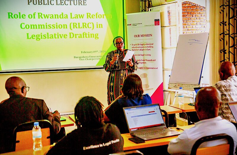On February 9th, 2024, Ms. BURAYOBERA UMUZAYIRE Bibiane, the Vice Chairperson of the Rwanda Law Reform Commission (RLRC), delivered a public lecture on the role of the commission in legislative drafting at the Institute of Legal Practice and Development (ILPD). This lecture was an integral part of ILPD's training strategies.